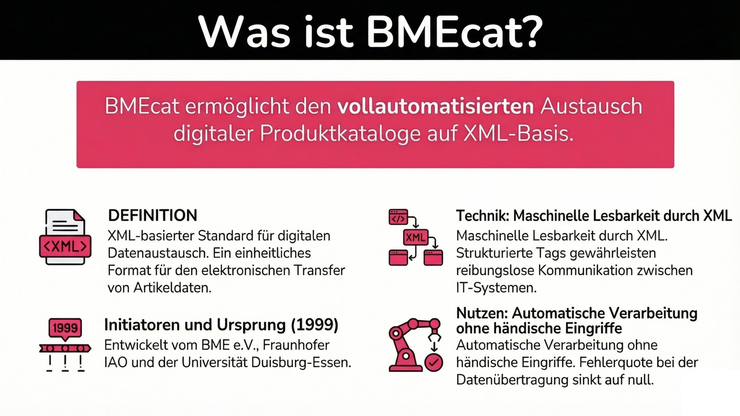 Die XML-Technologie bildet die Basis für die maschinelle Lesbarkeit. IT-Systeme verarbeiten die Artikelinformationen in XML Format dadurch automatisch. Zielsysteme importieren die Dateien ohne händische Eingriffe. Das senkt Fehlerquoten bei der Datenübertragung auf null.
