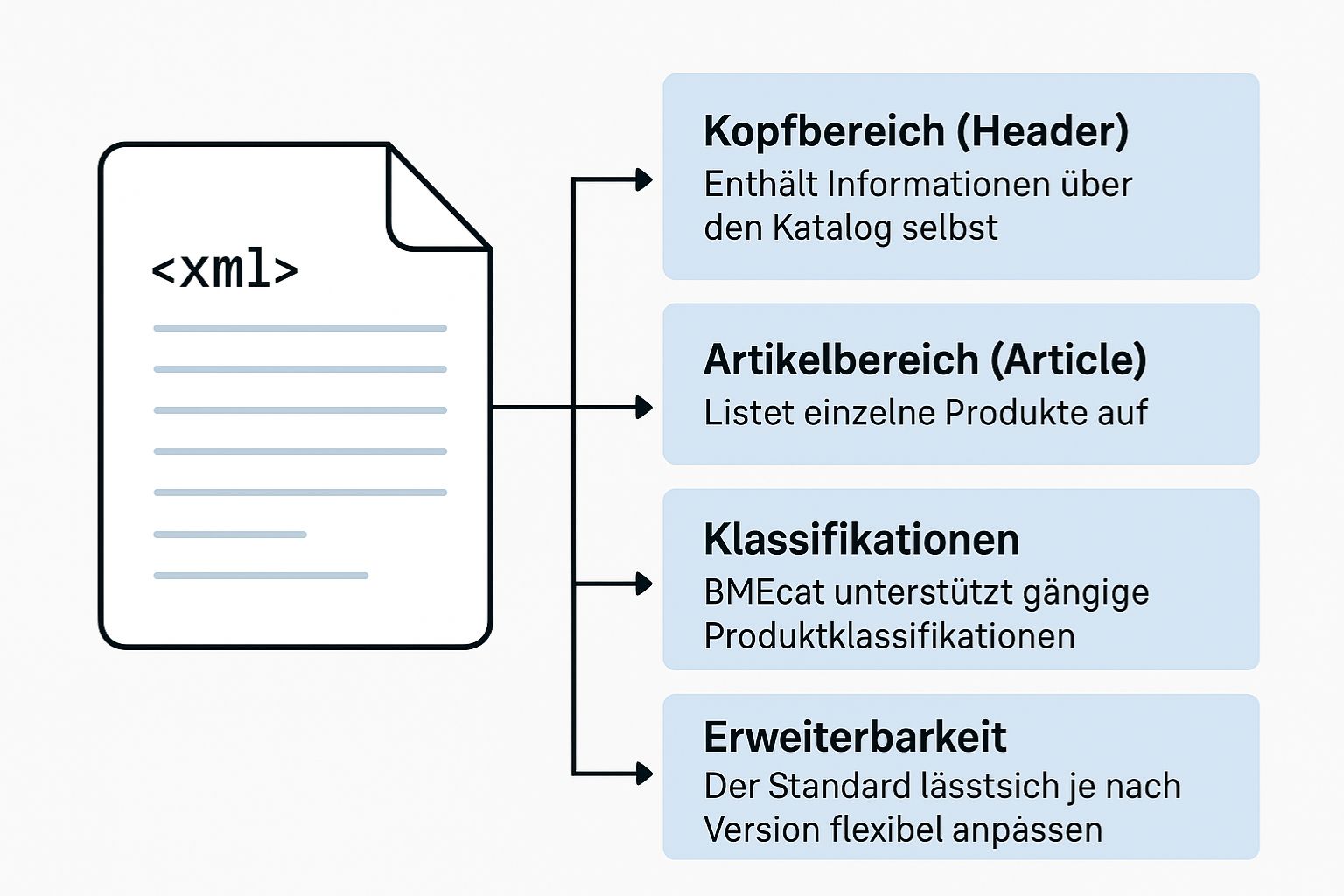 Ein BMEcat-Dokument beginnt mit dem Wurzelelement „BMECAT“. Die Datei besteht aus zwei Hauptbereichen. Jeder Teil erfüllt dabei eine Funktion.