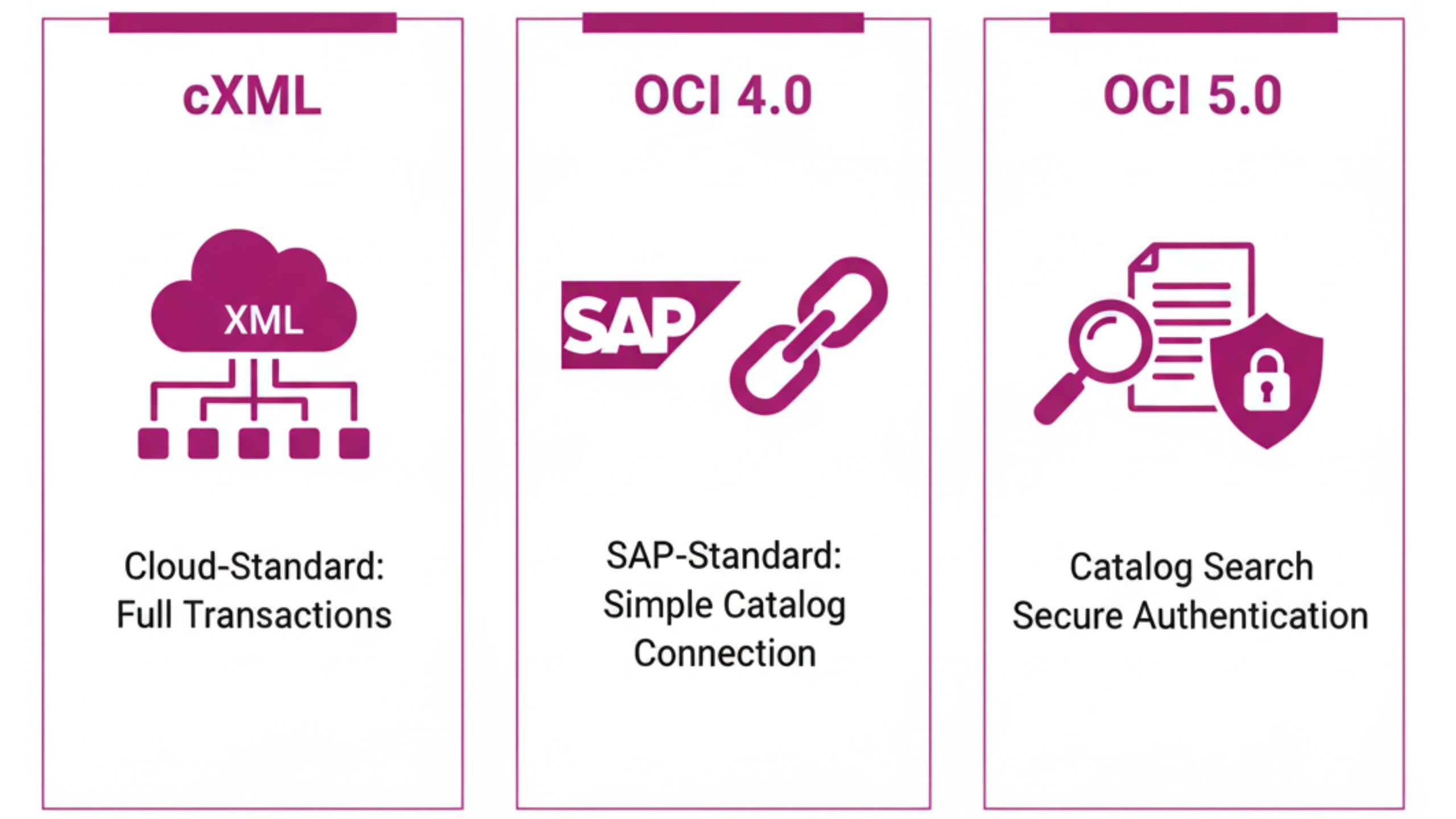 cXML ist der Standard für Cloud-Plattformen. Das Protokoll ermöglicht vollständige Punchout-Transaktionen. Es ist ein XML-basiertes Format. Systeme wie Coupa oder SAP Ariba nutzen cXML für den Austausch von Bestelldokumenten und Katalogdaten.